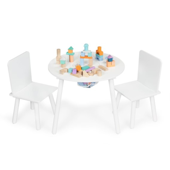 Wspaniały zestaw dla wszystkich maluchów, dzięki swojej prostej formie idealnie wpasuje się w wystrój dziecięcych pokoików, sal zabaw, czy poczekalni. Stół posiada solidne, sosnowe nogi nadające mu stabilności, blat wykonany jest z MDF-u co sprawia, że jest łatwy w utrzymaniu i odporny na uszkodzenia/zarysowania. Uzupełnieniem zestawu są dwa stabilne i wygodne krzesełka.