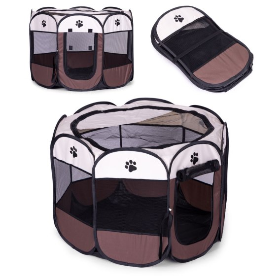 Samorozkładający, materiałowy kojec wykonany w kształcie ośmiokąta przeznaczony jest dla psów, szczeniąt, kotów oraz niewielkich zwierząt. Kojec jest idealnym rozwiązaniem dla właścicieli zwierząt, szczególnie gdy zajdzie potrzeba wydzielenia swoim pupilom bezpiecznej przestrzeni. Oferuje szereg praktycznych zastosowań, takich jak trening twojego pupila, wyznaczanie miejsca, w którym zwierzę może przebywać, oraz pełni rolę bezpiecznego schronienia.