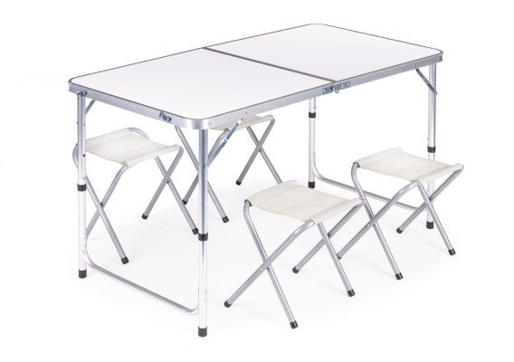Zestaw można złożyć w formę poręcznej walizki. Taborety, które wchodzą w skład całego kompletu mieszczą się w przestrzeni pod blatem stołu. Dzięki takiemu rozwiązaniu wszystko znajduję się w jednym miejscu, a tak złożoną walizkę można bez problemu zmieścić w wąskich przestrzeniach.
